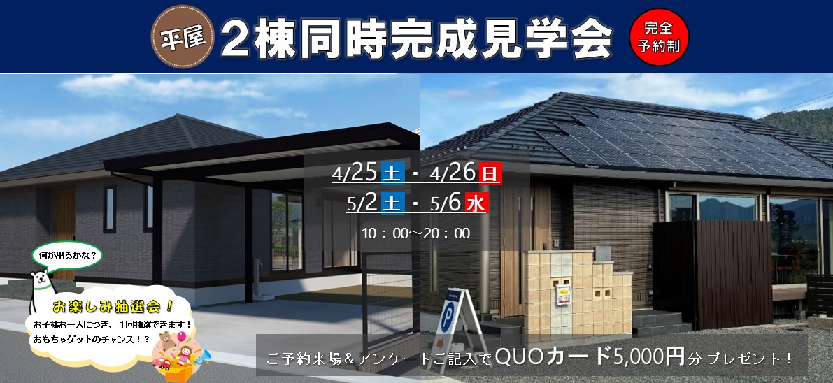 4/25(土)・4/26(日)・5/2(土)・5/6(水)10:00~20:00 氷上町石生分譲地(グリーンコート石生新町)内にて、2棟同時見学会を開催いたします! 花粉やPM2.5の侵入を許さない家を体感できたり、最近 …